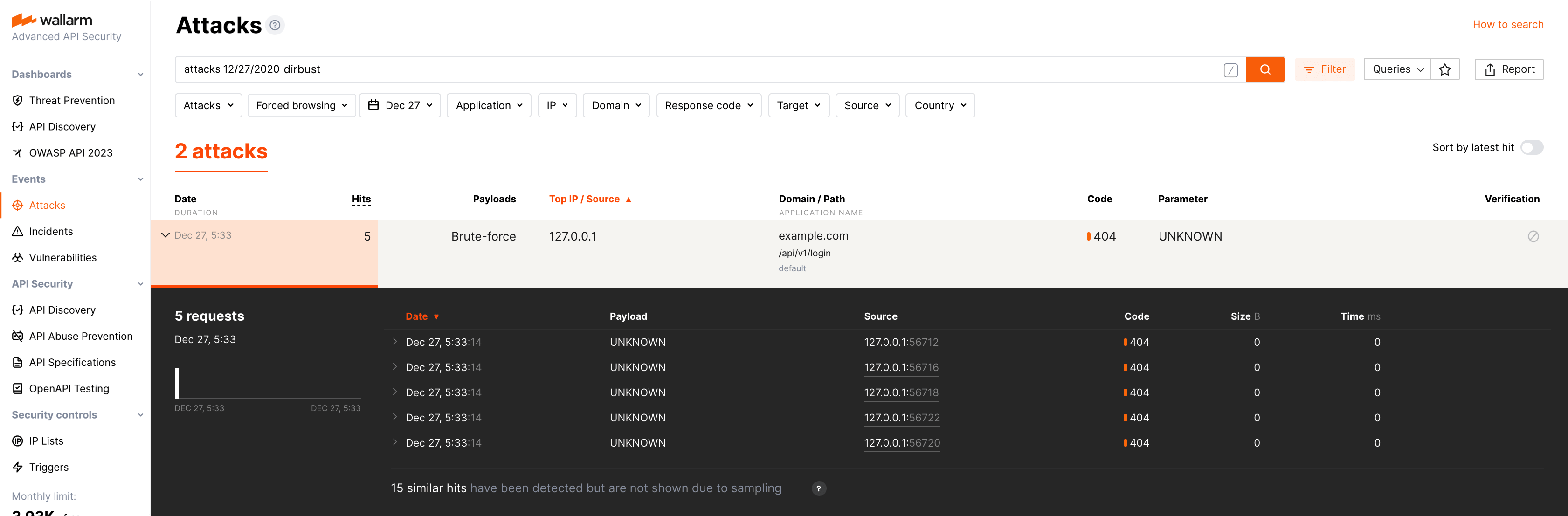 The number of displayed requests corresponds to the number of requests sent after exceeding the trigger threshold (more details on detecting behavioral attacks). If this number is higher than 5, request sampling is applied and request details are displayed only for the first 5 hits (more details on requests sampling).