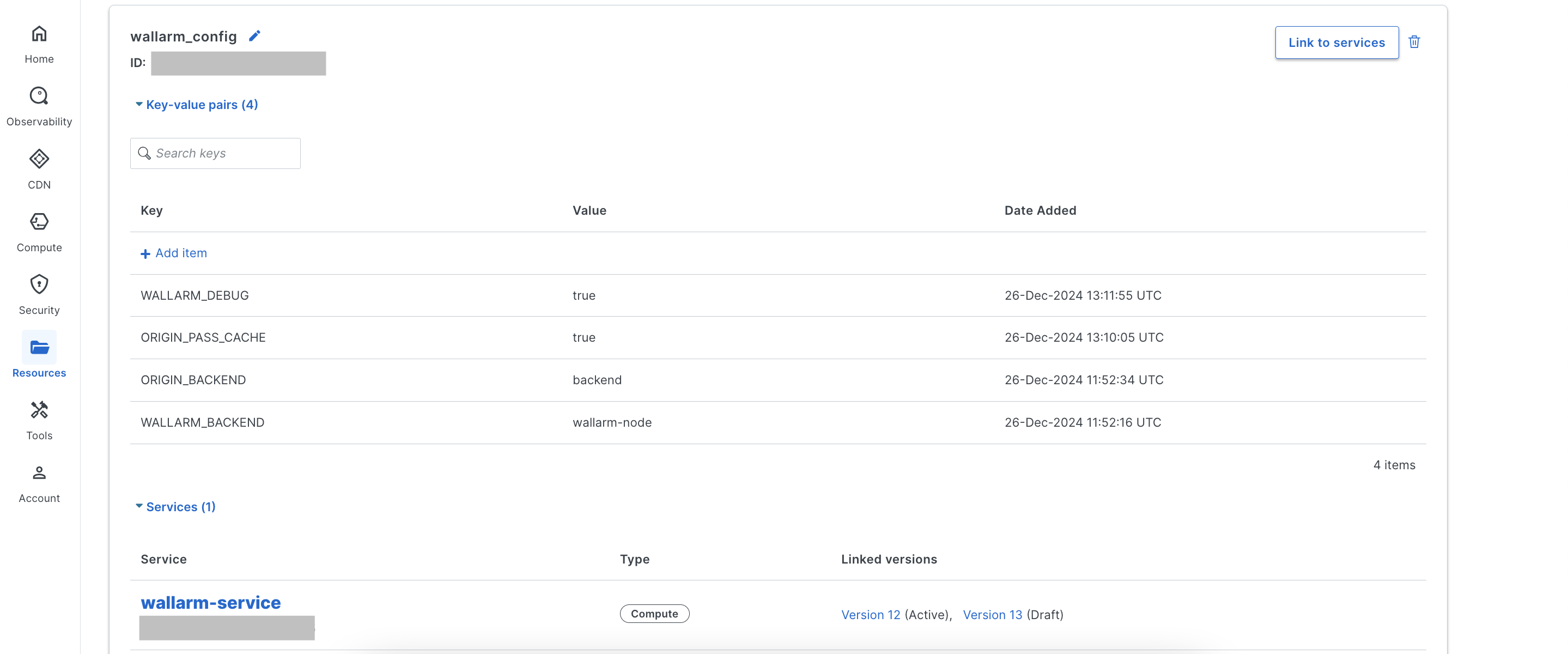 Go to Fastly UI → Compute → Compute services → Wallarm service → Edit configuration.
