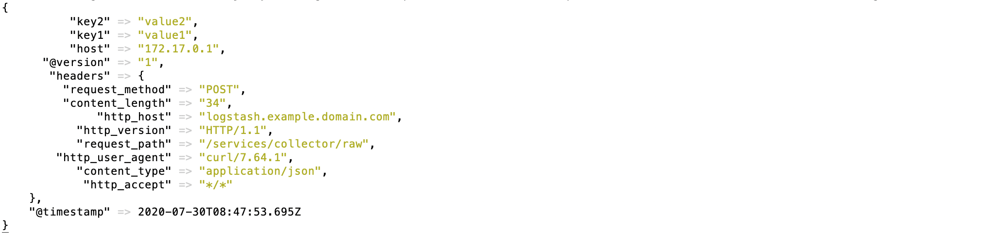curl -X POST 'https://logstash.example.domain.com' -H "Content-Type: application/json" -H "Authorization: Splunk 93eaeba4-97a9-46c7-abf3-4e0c545fa5cb" -d '{"key1":"value1", "key2":"value2"}'
