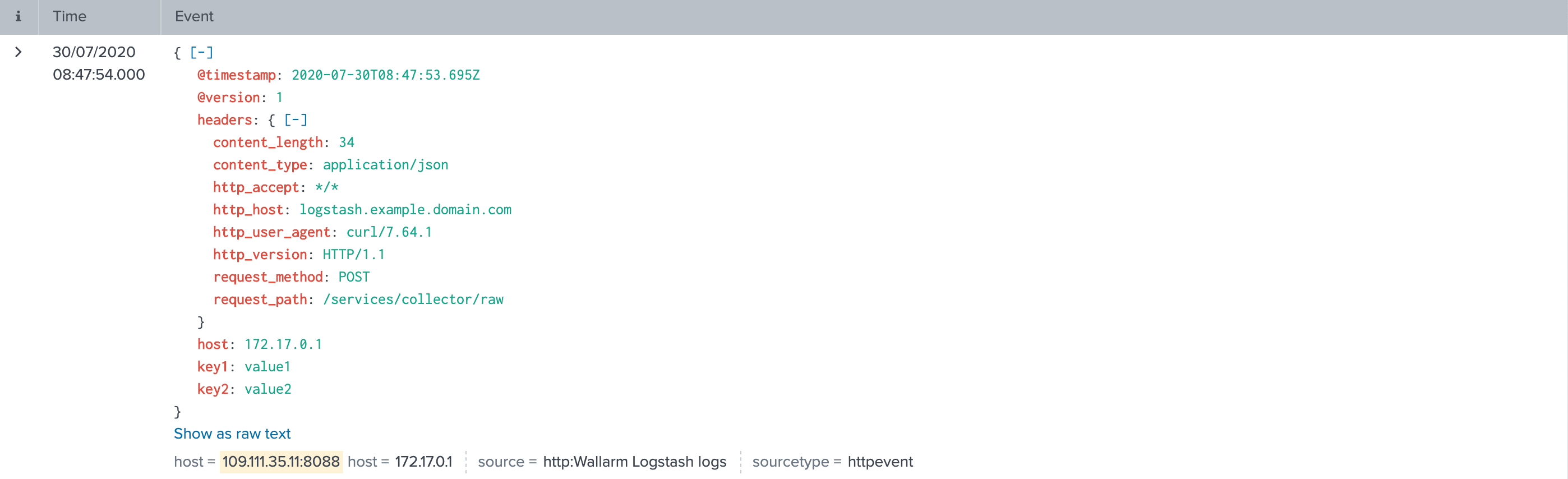• All event logs are forwarded from Logstash to Splunk API endpoint https://109.111.35.11:8088/services/collector/raw via POST requests. To authorize requests, the HTTPS Event Collector token is used